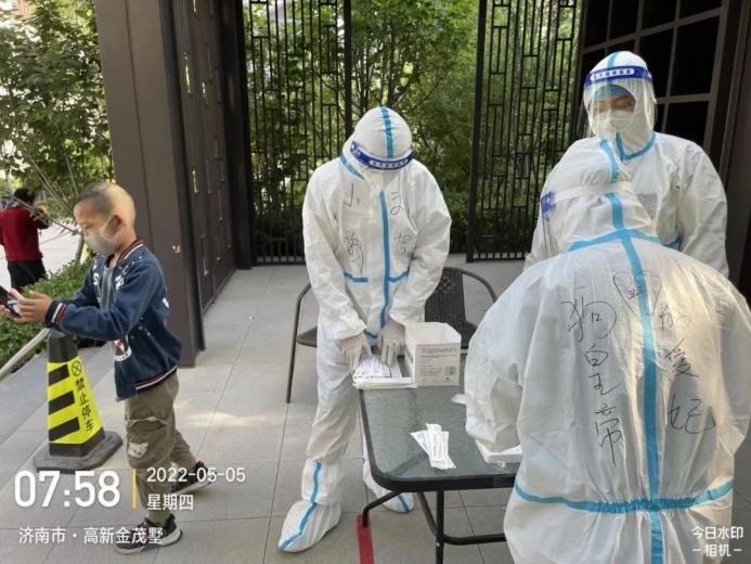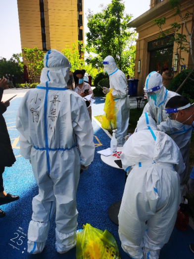 由于一直在高溫下“全副武裝”,志愿者的防護服早已被汗水浸濕,手掌被泡得發(fā)白,臉上也被口罩勒出了痕跡,更有志愿者出現了頭暈、流鼻血等中暑癥狀。盡管如此,他們也是稍加休整,便再次沖鋒向前。休息時間,志愿者們席地而坐,匆匆吃完奔赴崗位,因忙碌而錯過飯點更是常事,然而他們卻從未有過怨言;腰肌勞損、椎間盤不好的團隊干部即使腰疼的直不起來,也依舊抵擋不住他助力抗疫的熱情與行動?!▲喼驹刚邔敶ㄔ趨f助核酸檢測時,有一個小男孩很不配合,由于當天的核酸檢測并沒有貼紙,男孩媽媽便偷偷準備了小貼畫,拜托尋魯川給小朋友貼上。尋魯川很感動,并且樂意幫忙,尋魯川說:“他兩只大眼睛直勾勾的盯著貼紙看,特別萌,心都被萌化了,真是開心了一整天,所有的疲憊都一掃而空?!?nbsp;…… 在抗“疫”前線,小鴨人和社區(qū)居民們互相理解,互相配合,如此令人感動又暖心的事跡不勝枚舉。